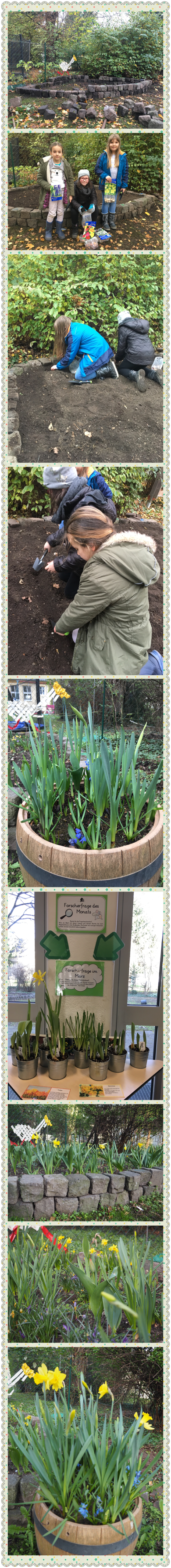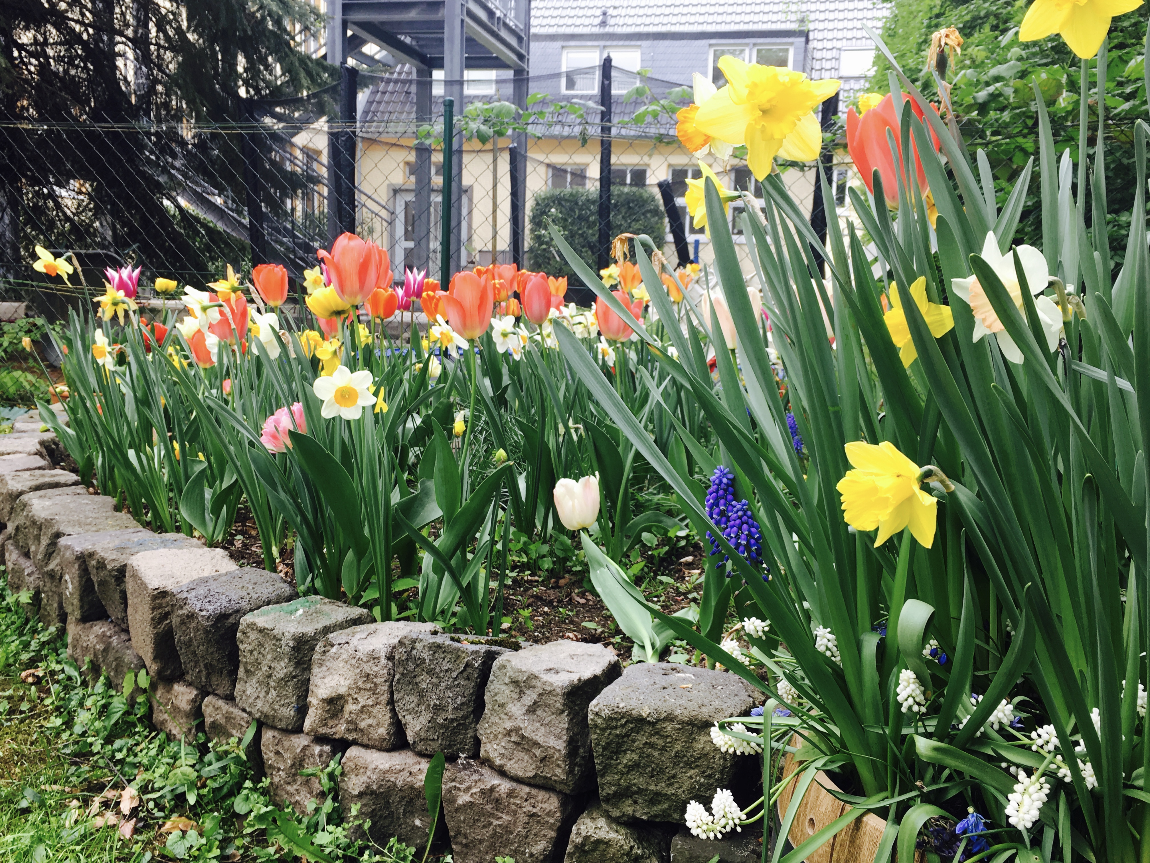 Unsere Pflanzaktion im Herbst war ein voller Erfolg und aktuell strahlen Tulpen, Narzissen, Hyazinthen und Co um die Wette in einem Beet unseres Schulgartens.