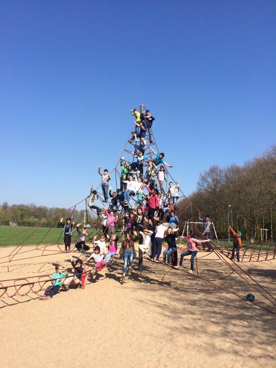 Am 04. April sind wir, also die Delfinklasse mit Frau Leicht, zusammen mit unserer Patenklasse, der Pinguinklasse, und ihrer Lehrerin Frau Heinrichs in der 3. und 4. Stunde in den Entenfang gegangen. Dort haben wir bei schönstem Frühlingswetter gefrühstückt und auf dem Spielplatz gespielt. Am Ende haben wir ausprobiert, ob alle auf das Klettergerüst passen. Es hat geklappt, wie ihr auf dem Foto sehen könnt.