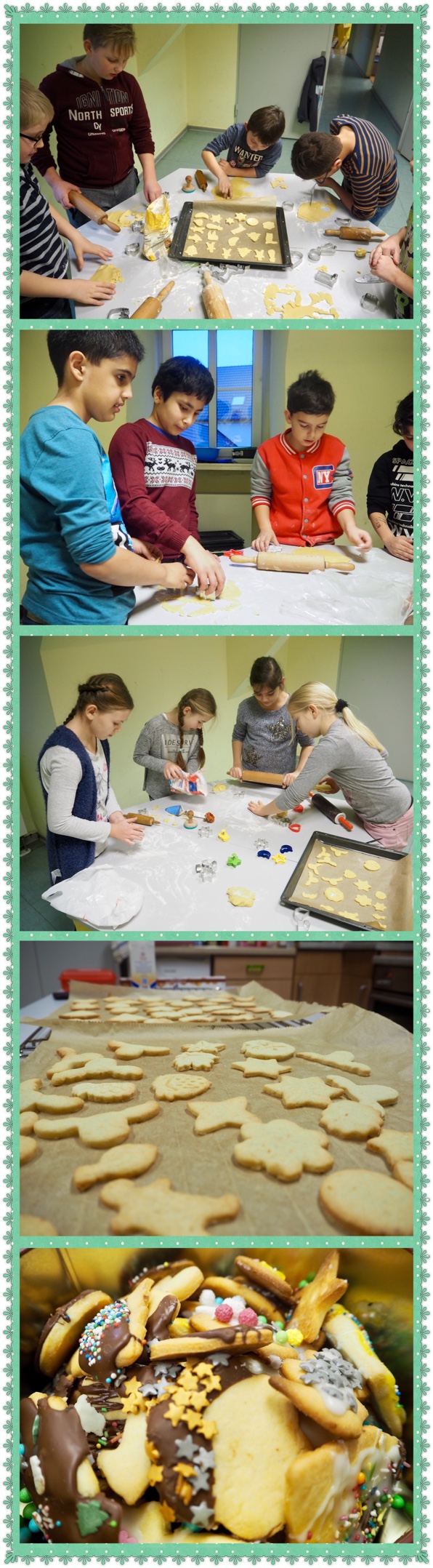 Am 13.12.2016 hat die Tigerklasse gebacken. In den ersten beiden Stunden hatten die Drittklässler schwimmen, aber die Viertklässler durften Plätzchen backen. Wir brauchten: Mehl, Plätzchenteig, Glasur und Streusel. Es gab einen Jungentisch und einen Mädchentisch. Wir rollten den Teig aus und stachen mit den Ausstechformen Kekse aus. Die Plätzchen kamen auf Bleche für 10-15 Minuten in den Ofen und wurden danach verziert. Lecker! Danach waren die Drittklässler vom Schwimmen zurück und konnten auch backen.