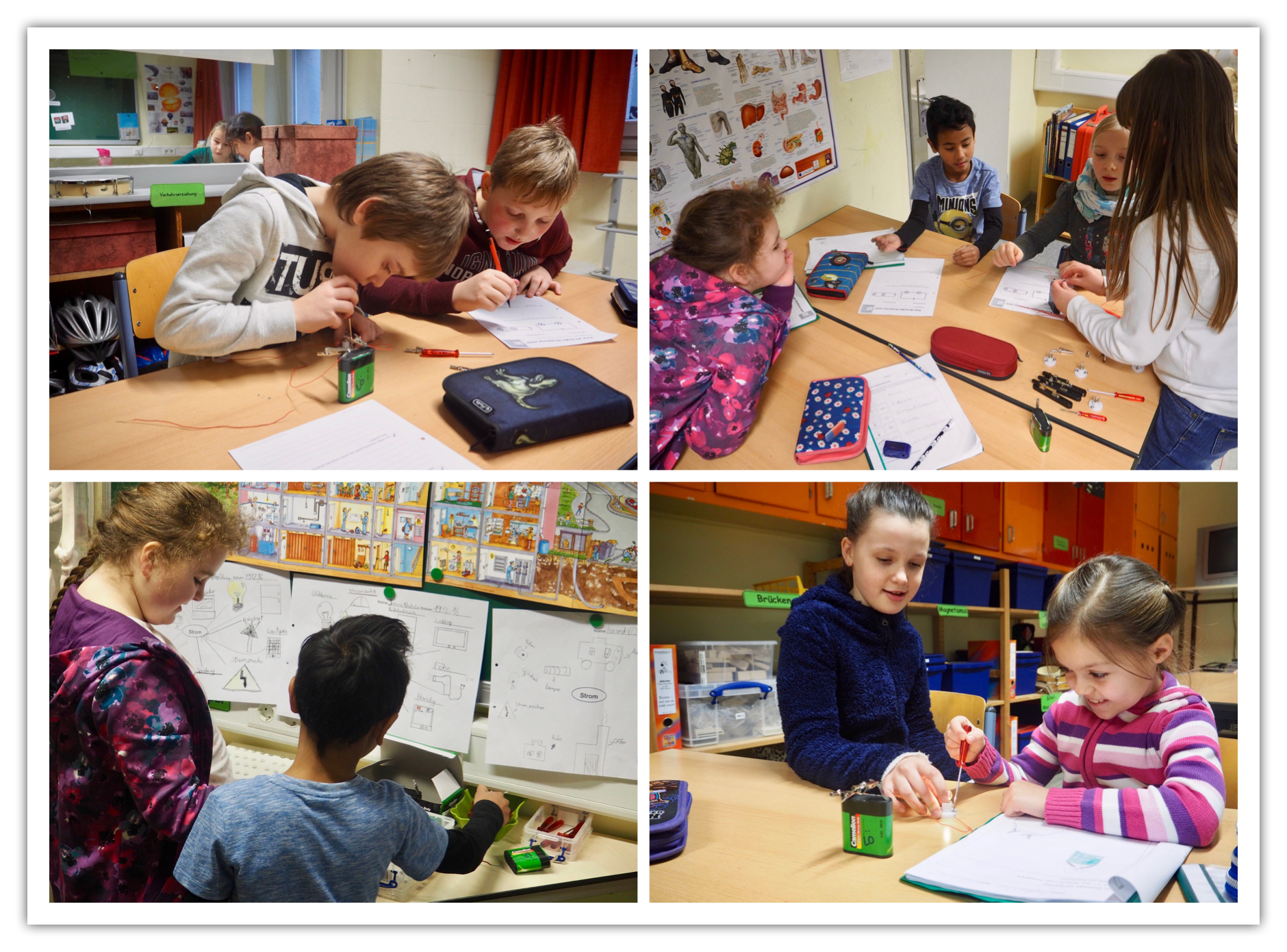 Im Forscherraum hat die Tigerklasse einige Wochen zum Thema Strom gearbeitet. Wir haben Stromkreise nachgebaut um kleine Glühlampen zum Leuchten zu bringen. Wir haben in dreier oder vierer Teams gearbeitet. Dazu verwendet haben wir: Drähte als Leiter, Schraubendreher, Flachbatterien und natürlich eine Glühlampe mit Fassung.